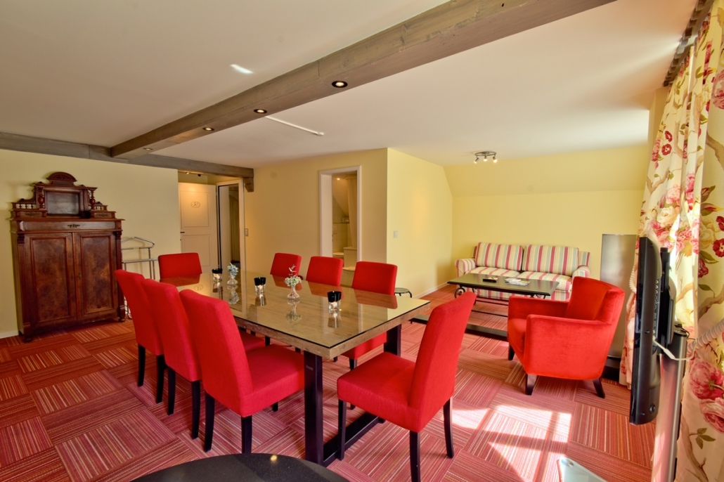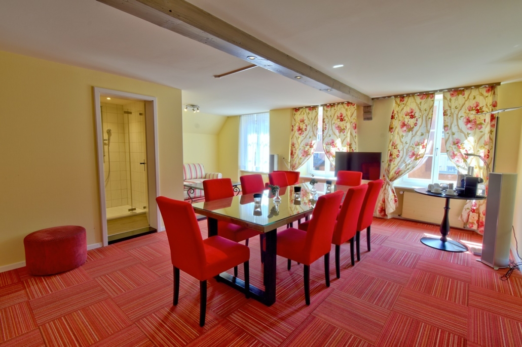Diese charmant eingerichtete Suite auf der zweitobersten Etage ist hell, reizvoll und bietet einen Ausblick auf die Fussgängerzone im historischen Dorfkern von Horgen, ein grosszügiges Wohnzimmer mit Sitzecke, Schlafsofa und einen Ess- und Arbeitstisch, sowie ein grosses, separates Schlafzimmer mit einem Doppelbett (180cmx200cm) für zwei Personen. Auf Wunsch ist ein zusätzliches Doppelzimmer über eine Verbindungstür verfügbar.